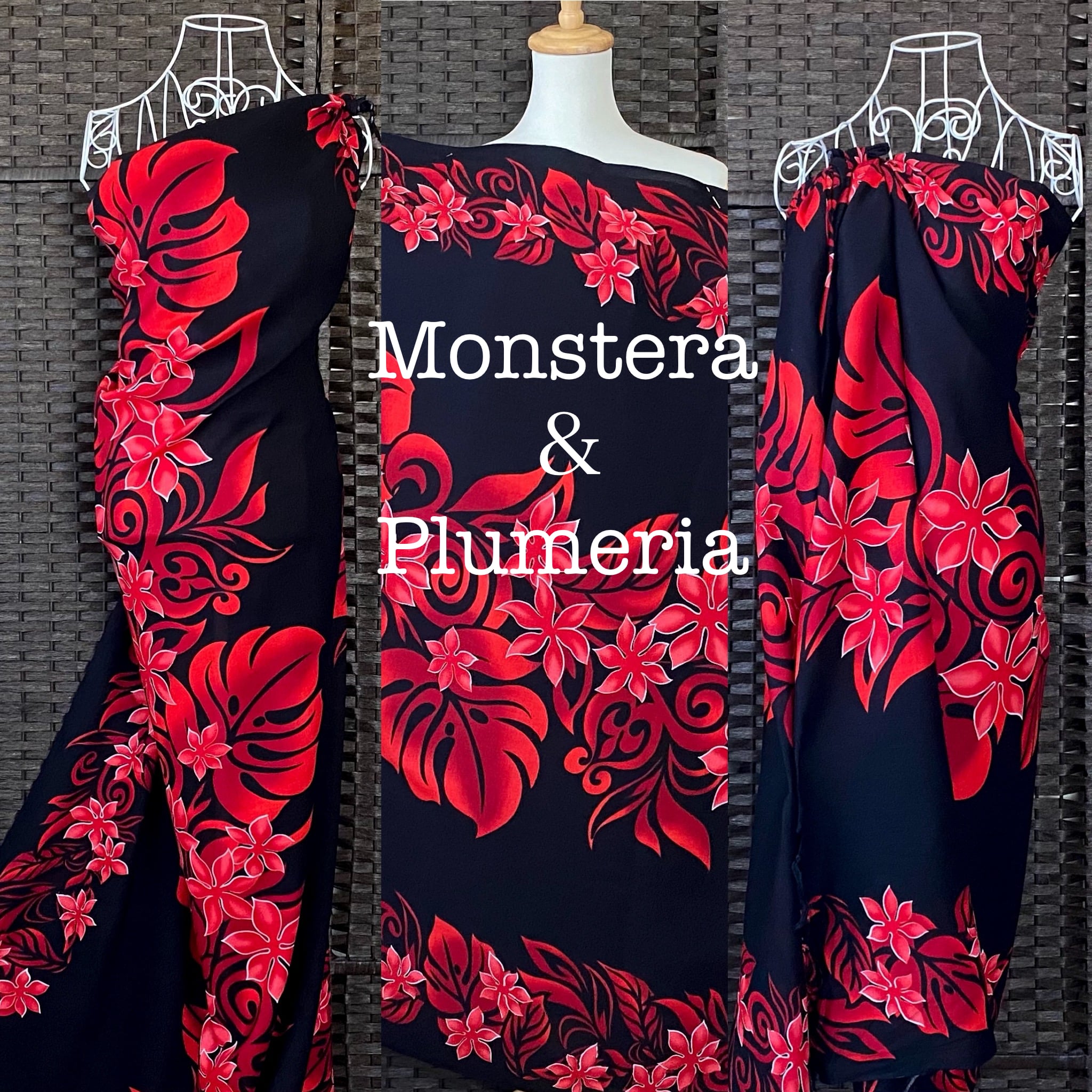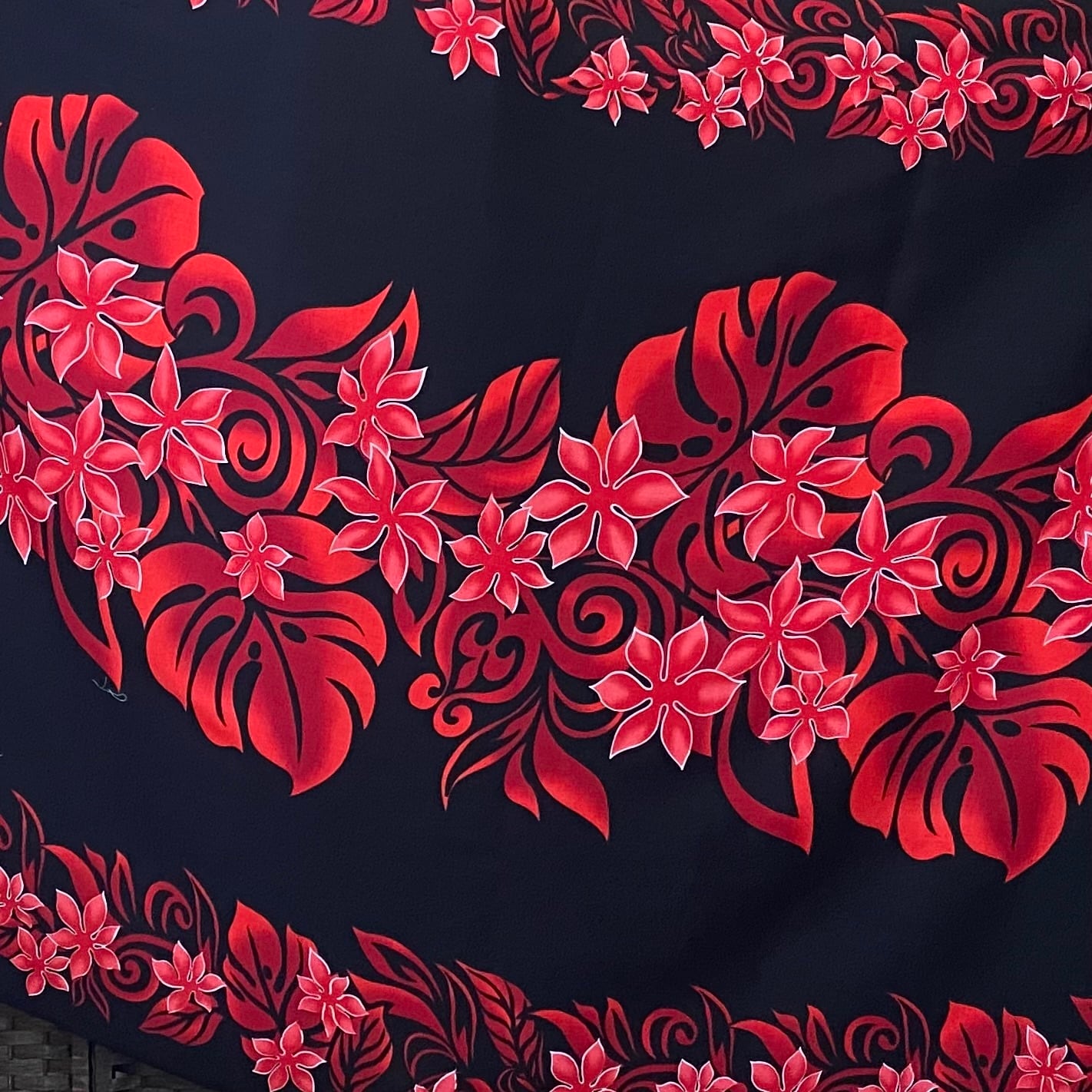 パレオ【黒地 モンステラ プルメリア 赤】レッド フラダンス タヒチアン