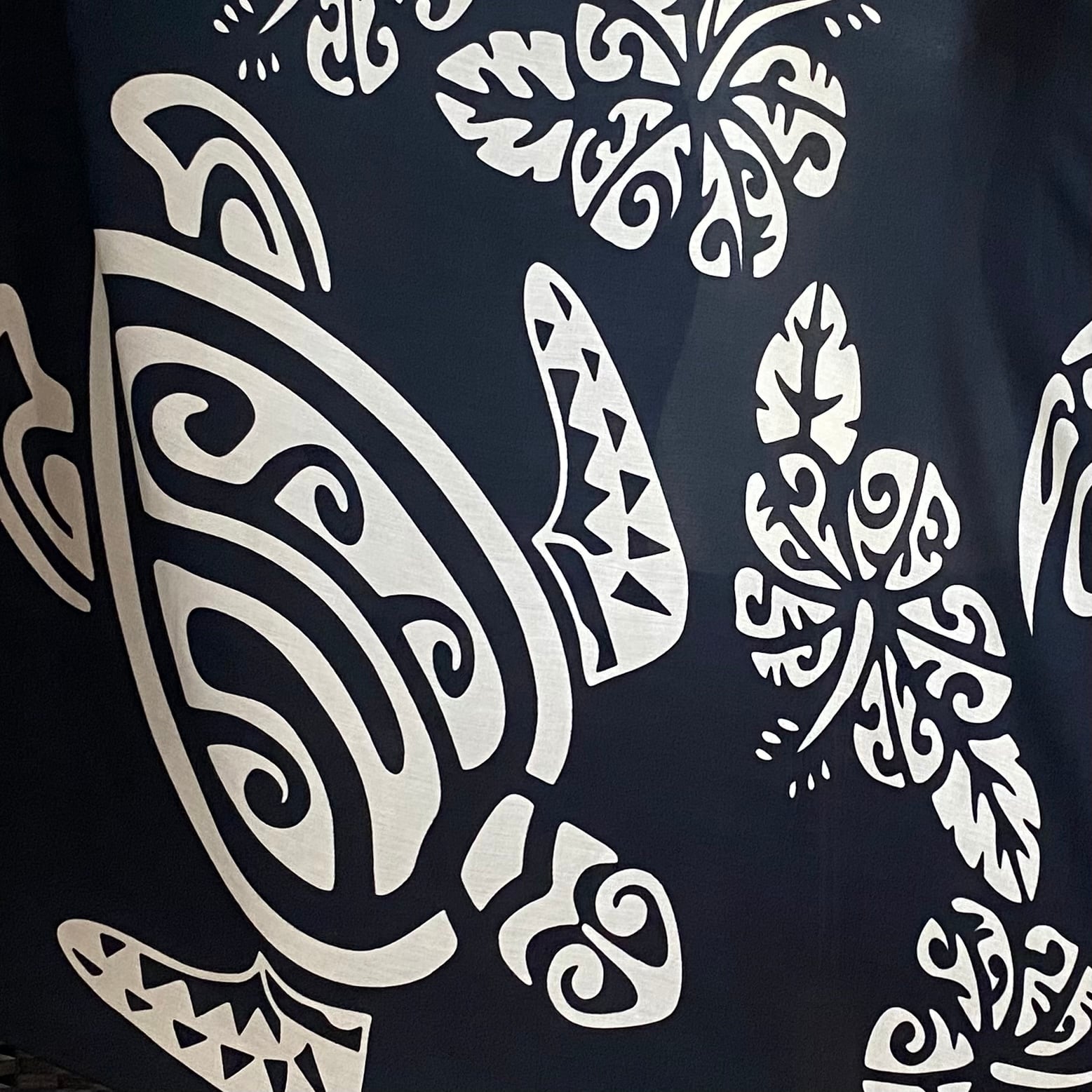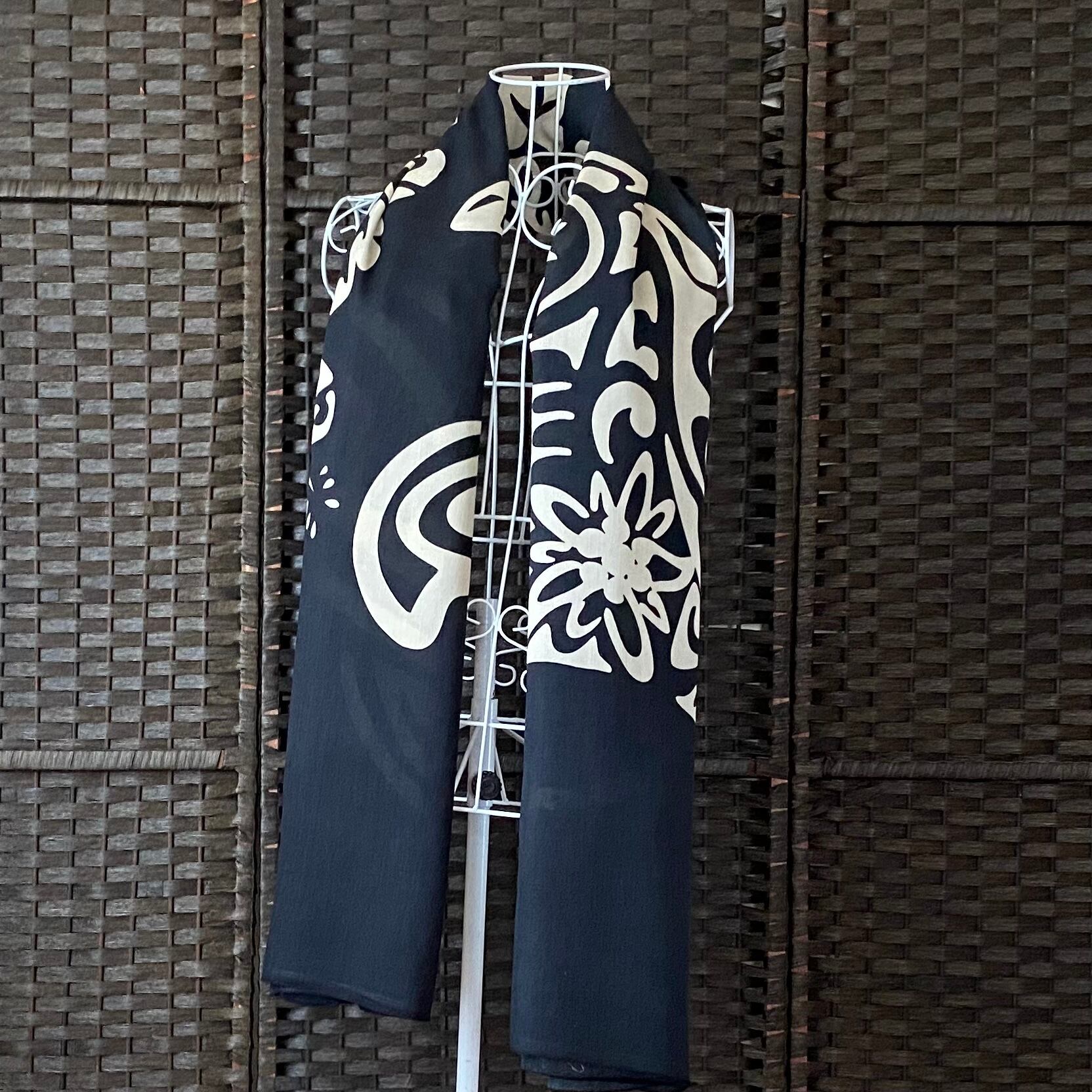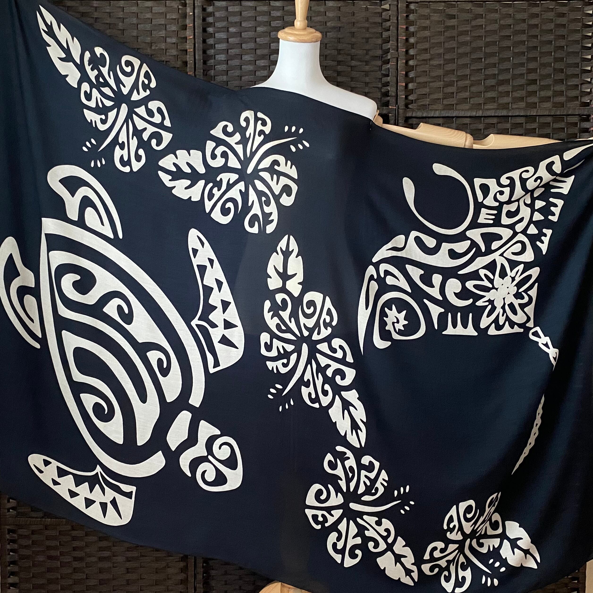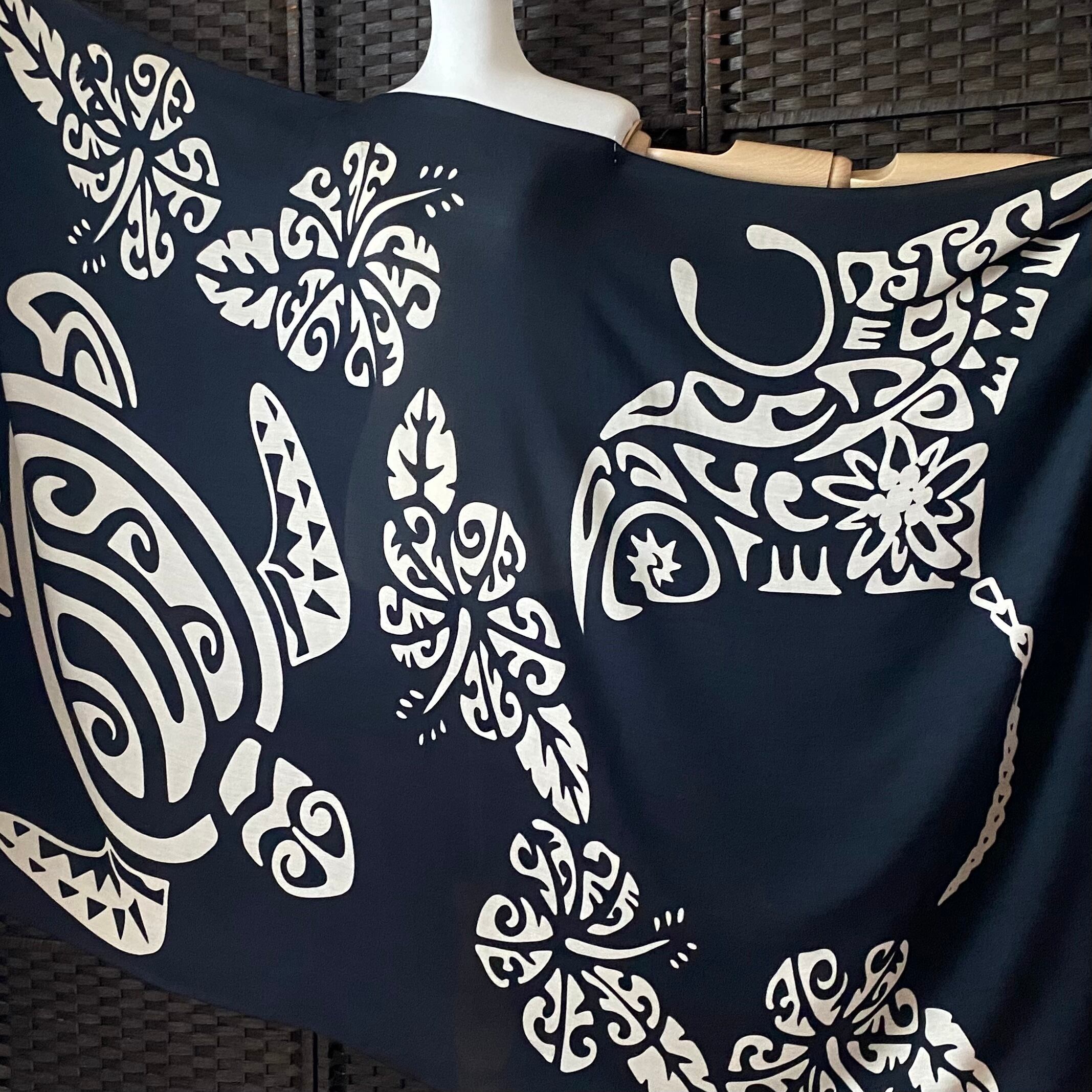マンタホヌ柄 【MANTA RAY TURTLE TATTOO-BLACK-WHITE 】ハワイ直輸入 パレオ 大判 ストール フラダンス タヒチアン